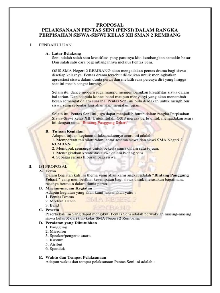 Proposal pentas seni (pensi) sma negeri 1 karanganyar i. Contoh dari proposal kegiatan pentas seni. Contoh proposal kegiatan hut ri Karang taruna "dwi mulya" desa pucangro kecamatan kalitengah kabupaten lamongan. Pendahuluan puji dan syukur kita panjatkan kehadirat allah swt yang telah memberikan limpahan .